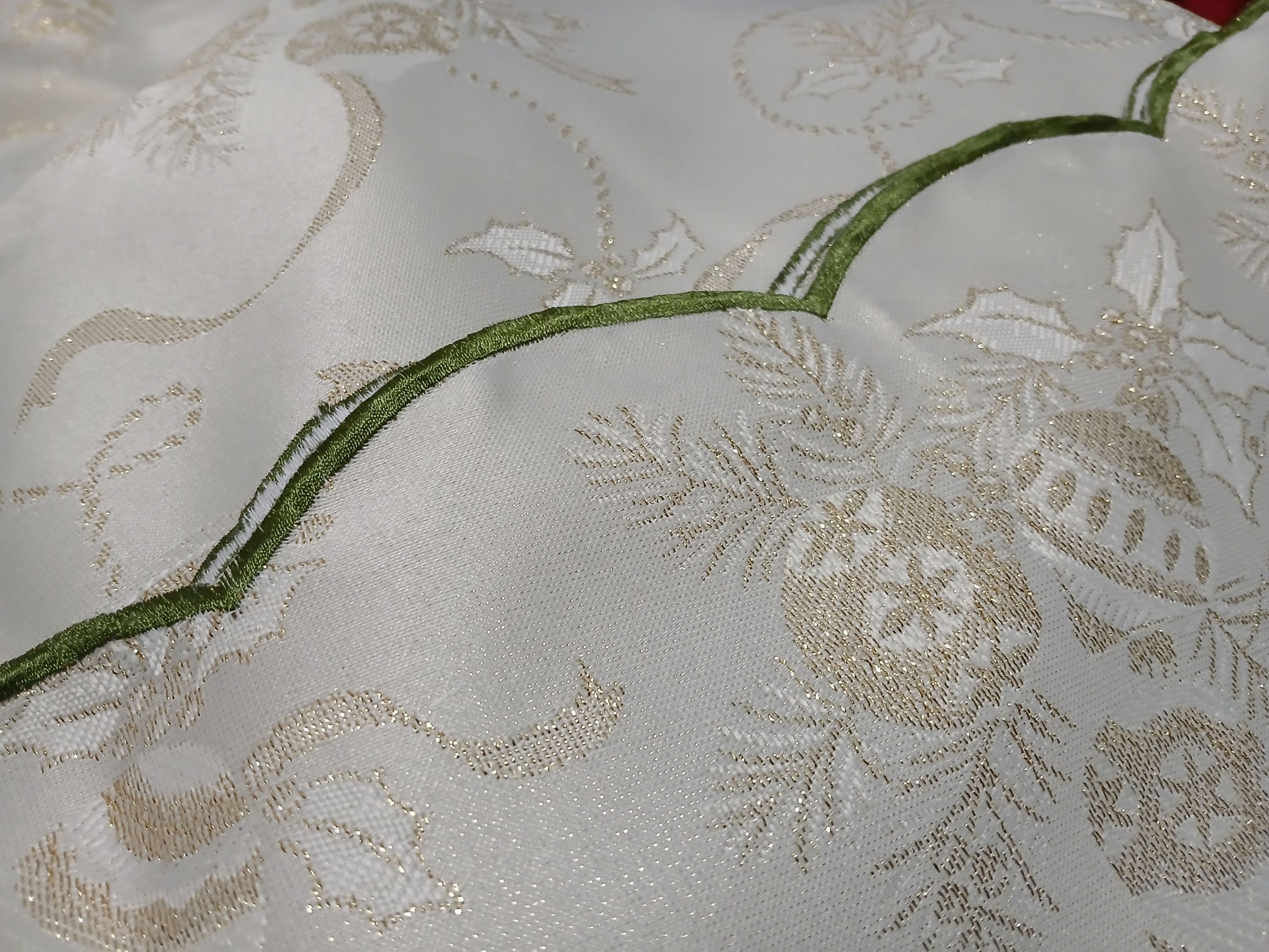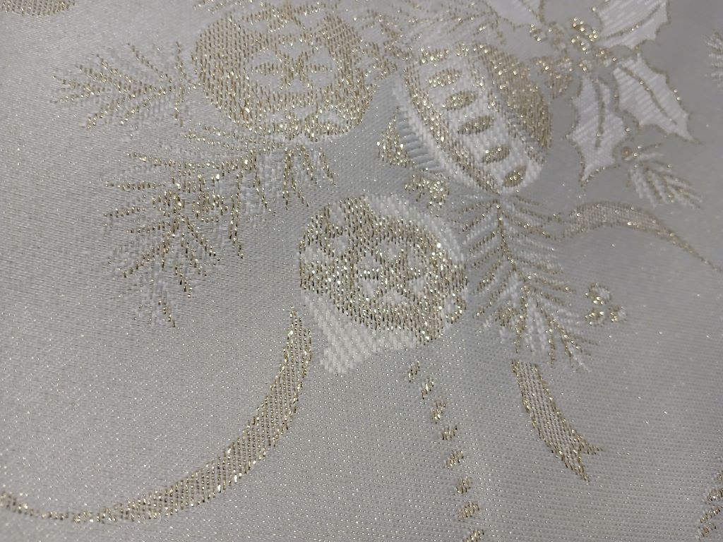 The Jacquard Christmas Tablecloth is a luxurious, festive solution for all your table decor needs. Jacquard is a type of fabric that is characterized by its intricate, woven patterns. It is named after the French weaver. Woven with intricate Christmas motifs—featuring tree ornaments, candles, presents, holly branches, and ribbons—this tablecloth brings elegance and holiday spirit to any gathering. The soft, luminous fabric is designed to be wrinkle-free. The subtle shimmer of gold thread adds a sparkling, luxurious touch, while the satiny green and gold-trimmed border enhances its festive appeal. Perfect for special occasions and everyday holiday meals, it’s available in a variety of sizes to suit most table.