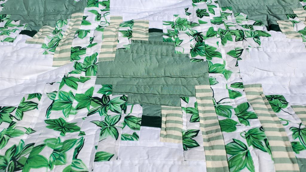 The Sparkling Green & White Courthouse Steps Prairie Point Border quilt features a vibrant, intricate patchwork design with floral and checkered patterns, combining squares and circular motifs.   The "Sparkling Green & White Courthouse Steps Prairie Point Border" quilt features a garden-like design with green and white leaf patterns mixed with green and beige stripes. The textured, layered appearance creates a three-dimensional effect.