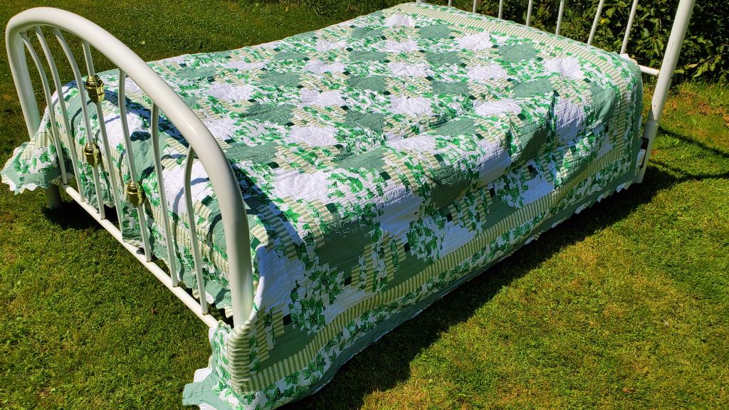 A white metal bed frame sits on a grassy lawn, adorned with the Sparkling Green & White Courthouse Steps Prairie Point Border quilt featuring green, white, and floral patterns. Sunlight creates quilted shadows, with lush greenery in the backdrop.   A white metal-framed bed featuring the Sparkling Green & White Courthouse Steps Prairie Point Border quilt sits outdoors on a grassy lawn, surrounded by greenery. The vintage-style bed has curved head and footboards.
